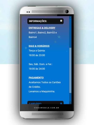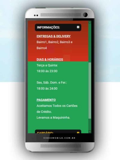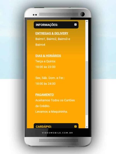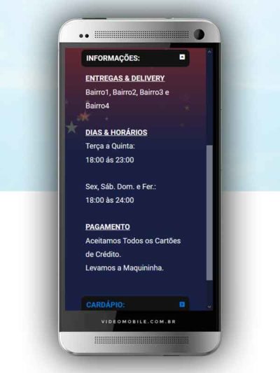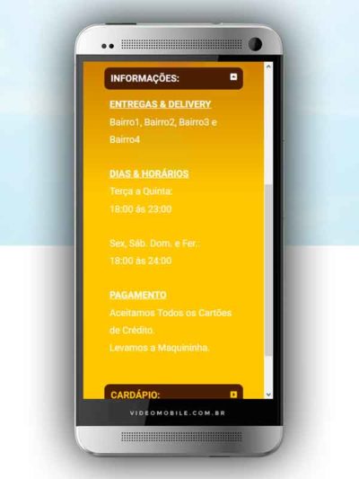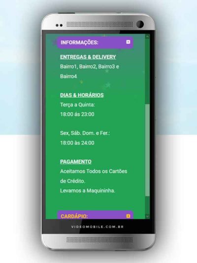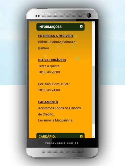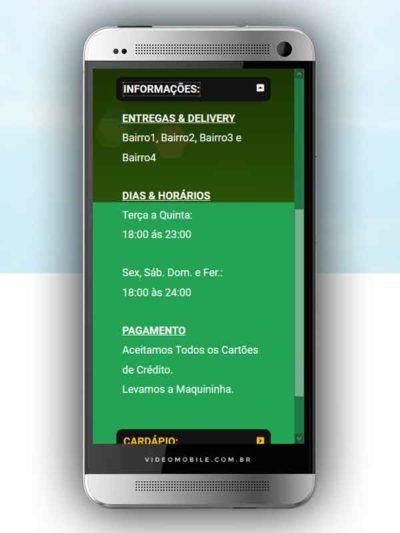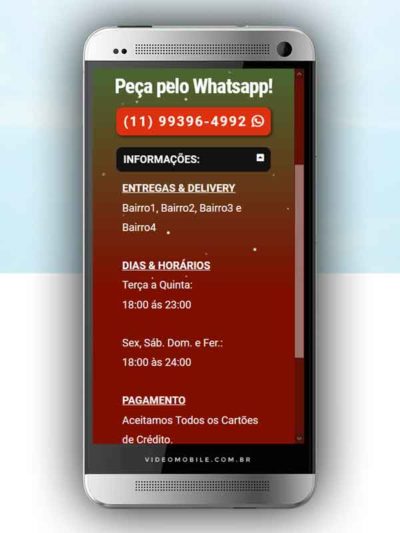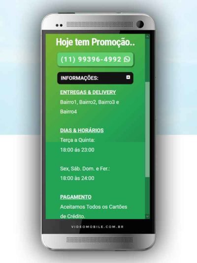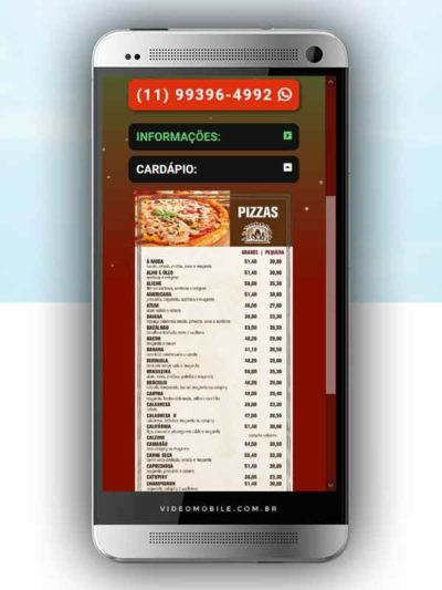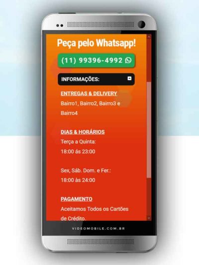 - Vídeo com botões clicáveis no celular para mostrar o CARDÁPIO e fazer PEDIDO pelo WHATSAPP. Possui ícones para o Instagram, Facebook, Pedido pelo Ifood, Google Maps para chegar ao local pelo GPS, botão de ligar para pedir por telefone e botão para o cliente compartilhar com sua lista de amigos do WhatsApp. BONUS: Vídeo para o Status do WhatsApp. VEJA…