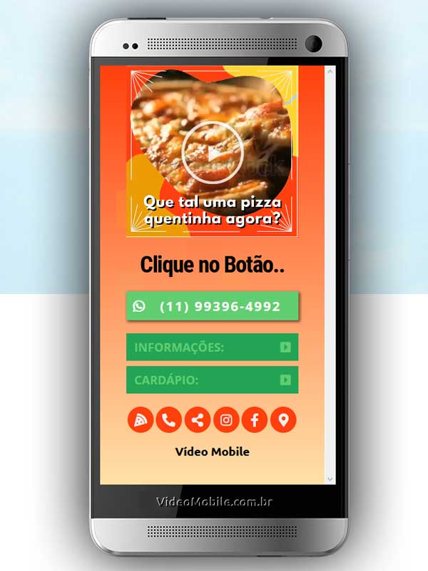 Vídeo com botões clicáveis no celular para mostrar o cardápio e fazer pedido pelo WhatsApp. Possui ícones para o Instagram, Facebook, Pedido pelo Ifood, Google Maps para chegar ao local pelo GPS, botão de ligar para pedir por telefone e botão para o cliente compartilhar com sua lista de amigos do WhatsApp. BONUS: Ganha versão do vídeo para Status WhatsApp.
