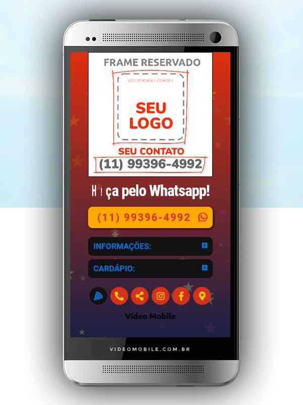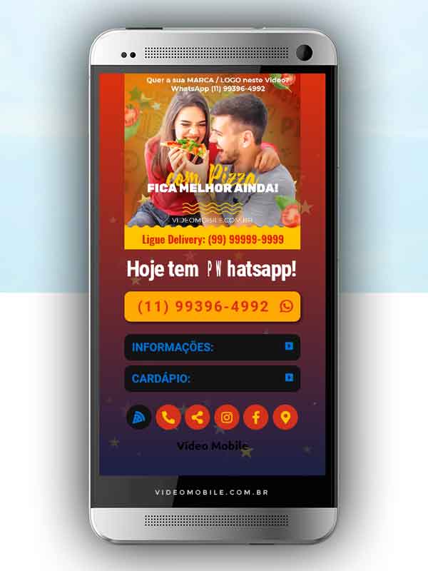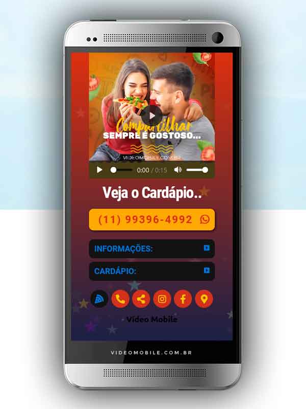 Vídeo com botões clicáveis no celular para mostrar o CARDÁPIO e fazer PEDIDO pelo WHATSAPP. Possui ícones para o Instagram, Facebook, Pedido pelo Ifood, Google Maps para chegar ao local pelo GPS, botão de ligar para pedir por telefone e botão para o cliente compartilhar com sua lista de amigos do WhatsApp. BONUS: Ganha versão do vídeo para Status WhatsApp.