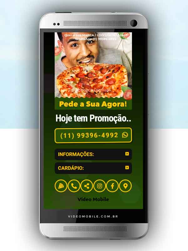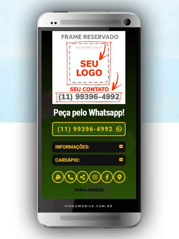 Vídeo com botões clicáveis no celular para mostrar o CARDÁPIO e fazer PEDIDO pelo WHATSAPP. Possui ícones para o Instagram, Facebook, Pedido pelo Ifood, Google Maps para chegar ao local pelo GPS, botão de ligar para pedir por telefone e botão para o cliente compartilhar com sua lista de amigos do WhatsApp. BONUS: Ganha versão do vídeo para Status WhatsApp.